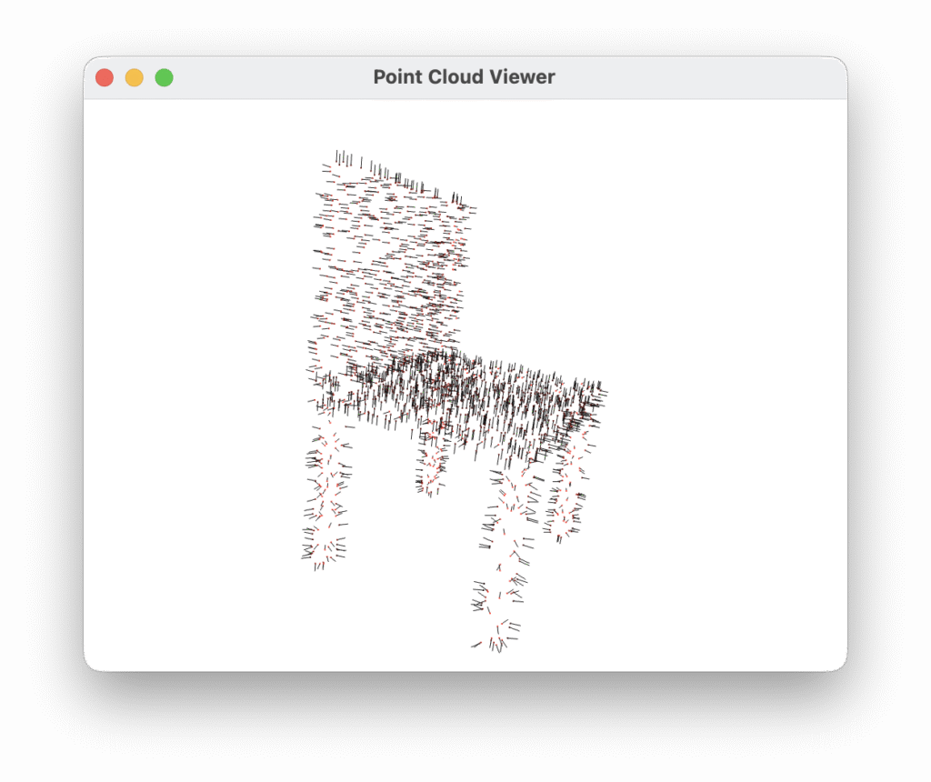 A desktop viewer built on Open3D lets you browse the dataset interactively, with each class rendered in a distinct colour. Pressing V toggles the display of surface normal vectors — a useful sanity check that the normals are geometrically consistent with the underlying shape.